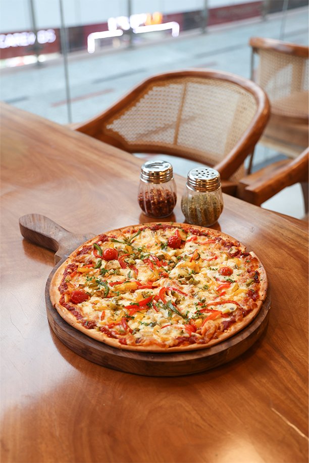 A vibrant medley of onions, mushrooms, bell peppers, anp olives, topped with gooey mozzarella cheese-a perfect choice for vegetable lovers