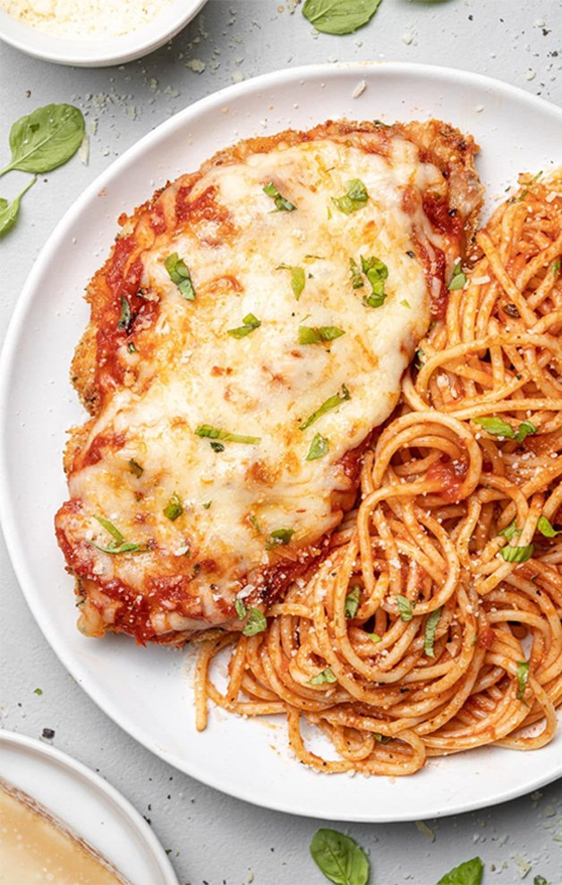 Crispy, golden chicken breast coated in parmesan, served atop spaghetti tossed in a rich tomato sauce and seasoned with chili flakes, oregano, salt, and pepper for a flavorful, comforting dish.
